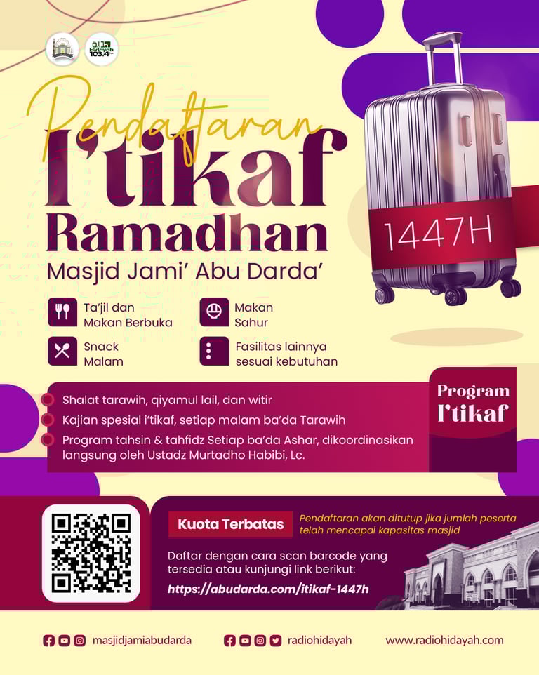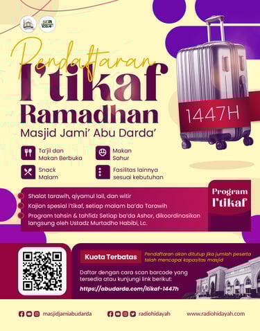 ā Diharapkan peserta I'tikaf dapat hadir di Masjid Jami' Abu Darda' pada ba'da shalat Ashar berjamaah, 20 Ramadhan 1447H.