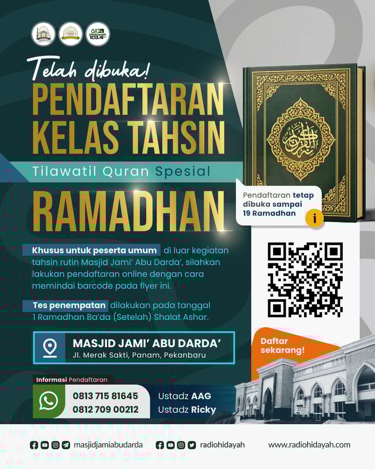 Alhamdulillah, program Tahsin Tilawatul Qur’an di Masjid Jami’ Abu Darda’, Jl. Merak Sakti, Panam – Pekanbaru, masih dibuka untuk pendaftaran.