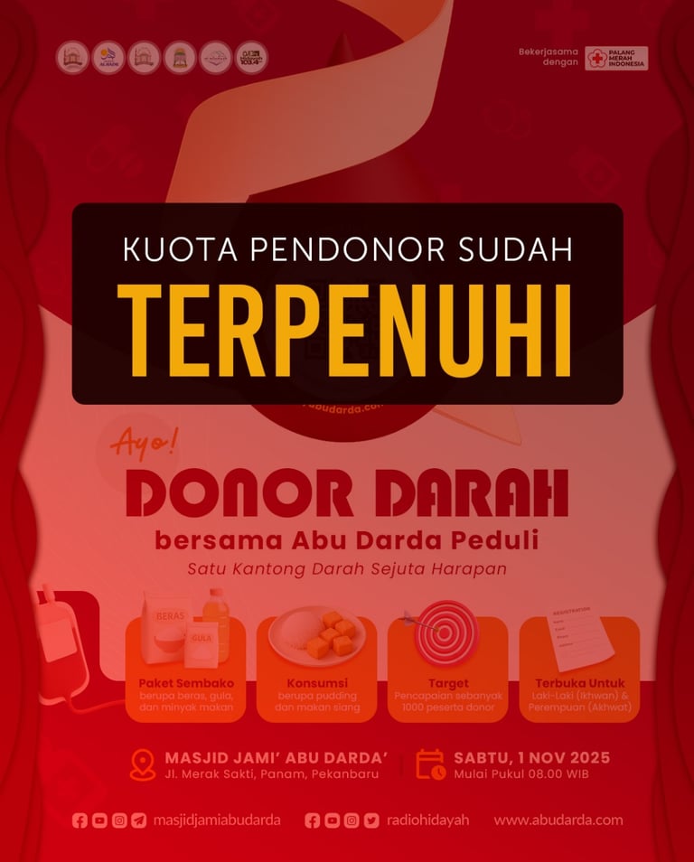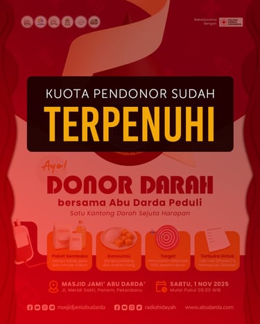 Masjid Jami’ Abu Darda’, Masjid Jami' Al Badr, SIT Al Bayyinah, Ma'had Abu Darda' Ash Shohaby, Ma'had Tahfidz Al Misykaah bekerja sama dengan PMI Pekanbaru mengundang seluruh jamaah dan masyarakat untuk berpartisipasi dalam kegiatan Donor Darah.